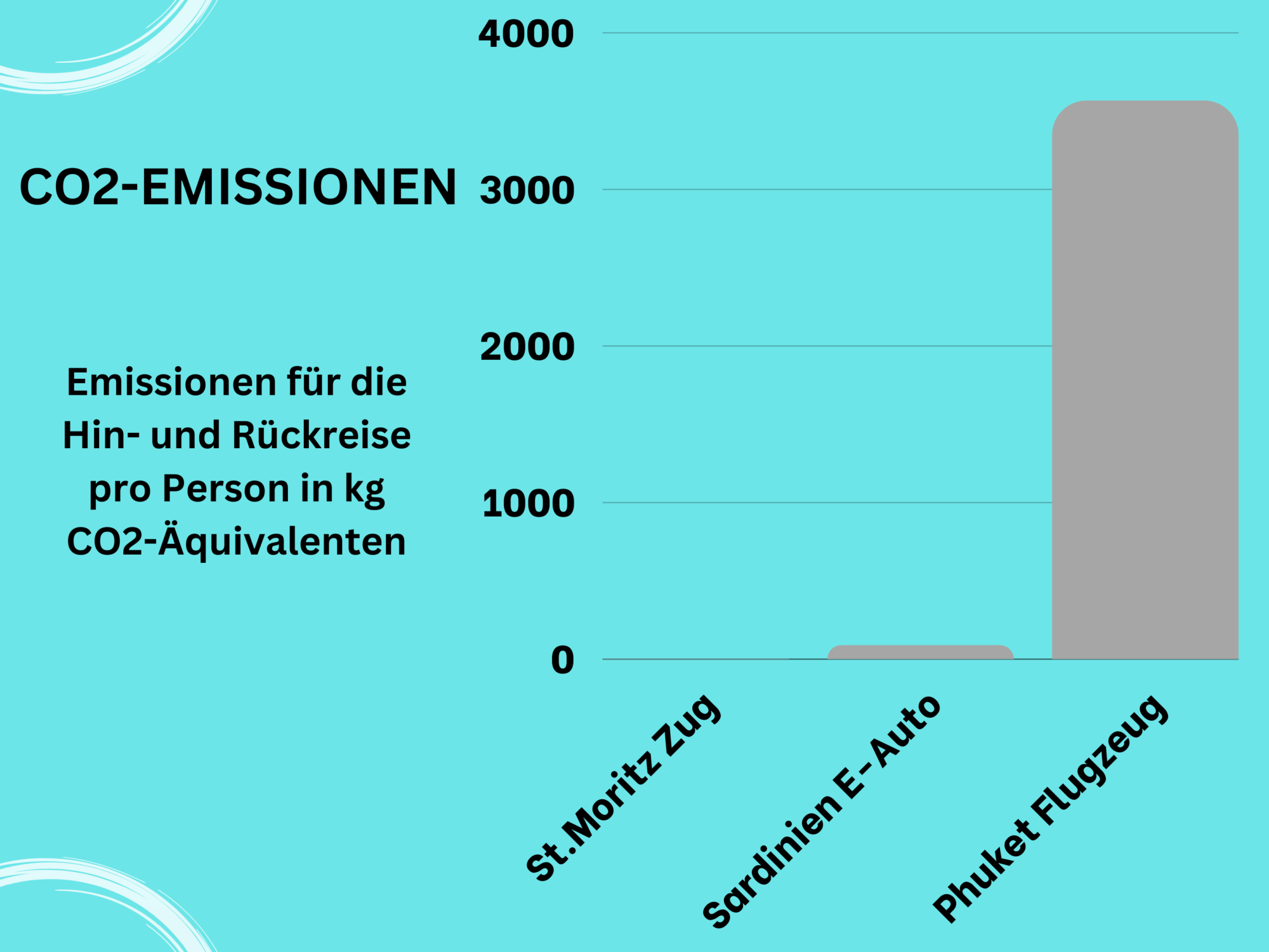 Allein mit einem Thailand-Flug sind schon ein Viertel der durchschnittlichen Schweizer Pro-Kopf-Emissionen pro Jahr (14 Tonnen CO2) erreicht. Er ist rund acht Mal klimaschädlicher als Familienferien auf Sardinien mit dem Flugzeug und Verbrenner-Auto vor Ort und rund 40 Mal klimaschädlicher als die Reise nach Sardinien mit E-Auto und Fähre.